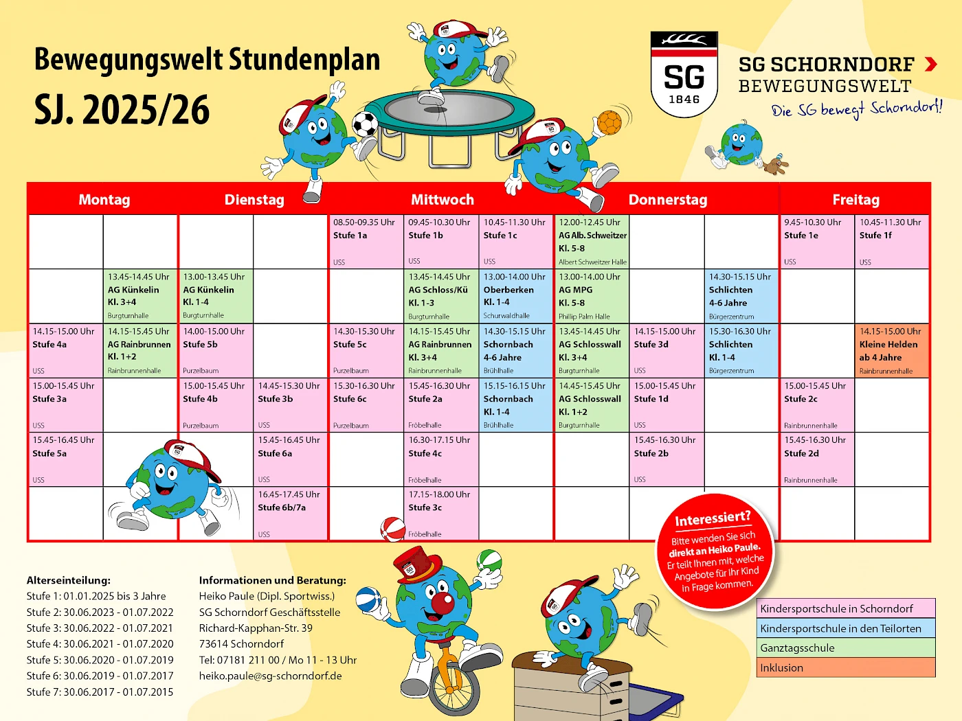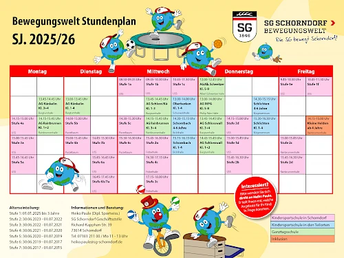 Hier findet ihr die aktuellen Trainingszeiten der Bewegungswelt sowie die Beiträge für die Teilnahme. Stundenplan und Gruppeneinteilung orientieren sich am Schuljahr und werden jährlich im September aktualisiert.